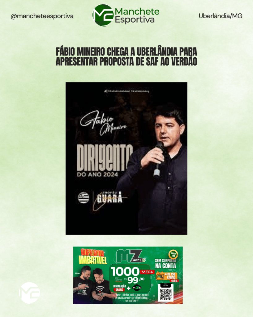 O empresário Fábio Mineiro já está em Uberlândia e se reúne nesta segunda-feira (13), às 19h, com os conselheiros do Uberlândia Esporte Clube no mezanino do Barolo, no Center Shopping. Ele irá apresentar oficialmente a proposta de transformar o Verdão em uma Sociedade Anônima do Futebol (SAF).