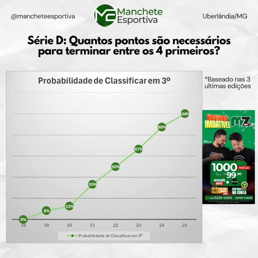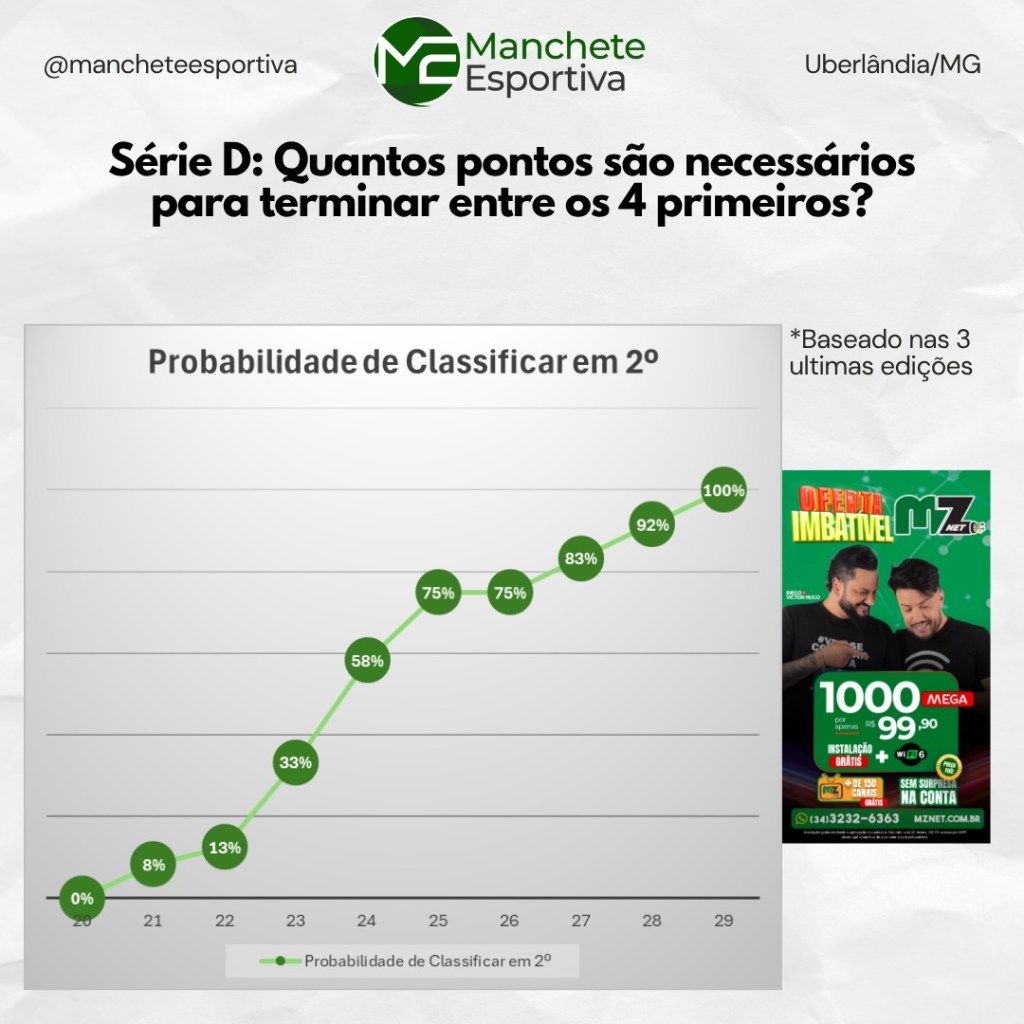 Faltando 6 rodadas para o fim da primeira fase da Série D, a briga por uma vaga na próxima etapa está cada vez mais apertada. Com base nos três últimos Campeonatos Brasileiros da Série D, é possível estimar as chances de uma equipe terminar entre os quatro primeiros colocados do grupo — posição que garante a classificação para o mata-mata.
