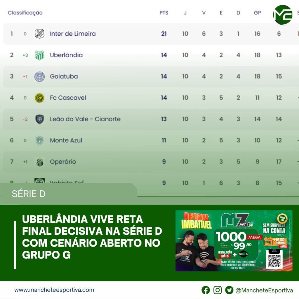 Com confrontos diretos entre os postulantes ao G-4 nas rodadas finais, cada ponto conquistado ou perdido pode definir o futuro do Uberlândia. A campanha nas próximas duas rodadas será decisiva para manter viva a esperança do acesso.