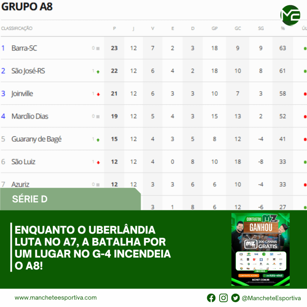Faltando apenas duas rodadas para o fim da primeira fase da Série D, o Grupo A8 promete fortes emoções na briga pelas vagas no mata-mata. Com Barra-SC (23 pontos), São José-RS (22) e Joinville (21) praticamente garantidos na próxima fase, a disputa se concentra pela quarta e última vaga, atualmente ocupada pelo Marcílio Dias, que soma 19 pontos.