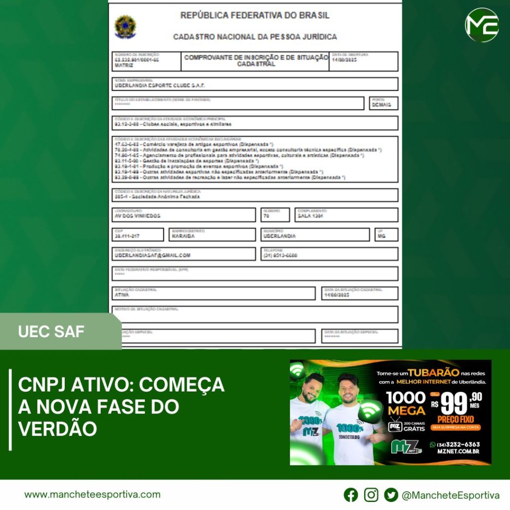 A Sociedade Anônima do Futebol (SAF) do Uberlândia Esporte Clube já está devidamente constituída e com CNPJ ativo. Registrada sob a razão social “Uberlandia Esporte Clube S.A.F.”, a nova estrutura empresarial foi aberta em 14 de agosto de 2025, com o número de inscrição 62.232.901/0001-66, e encontra-se em situação cadastral ativa.